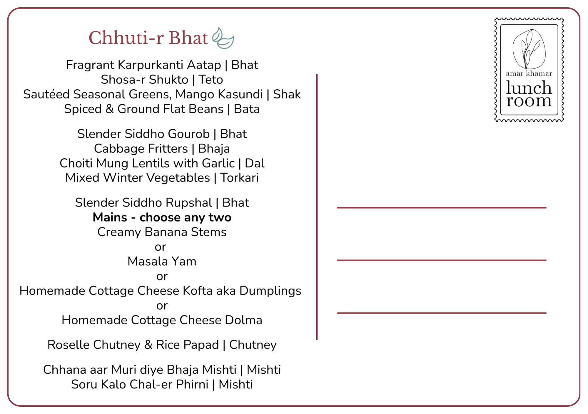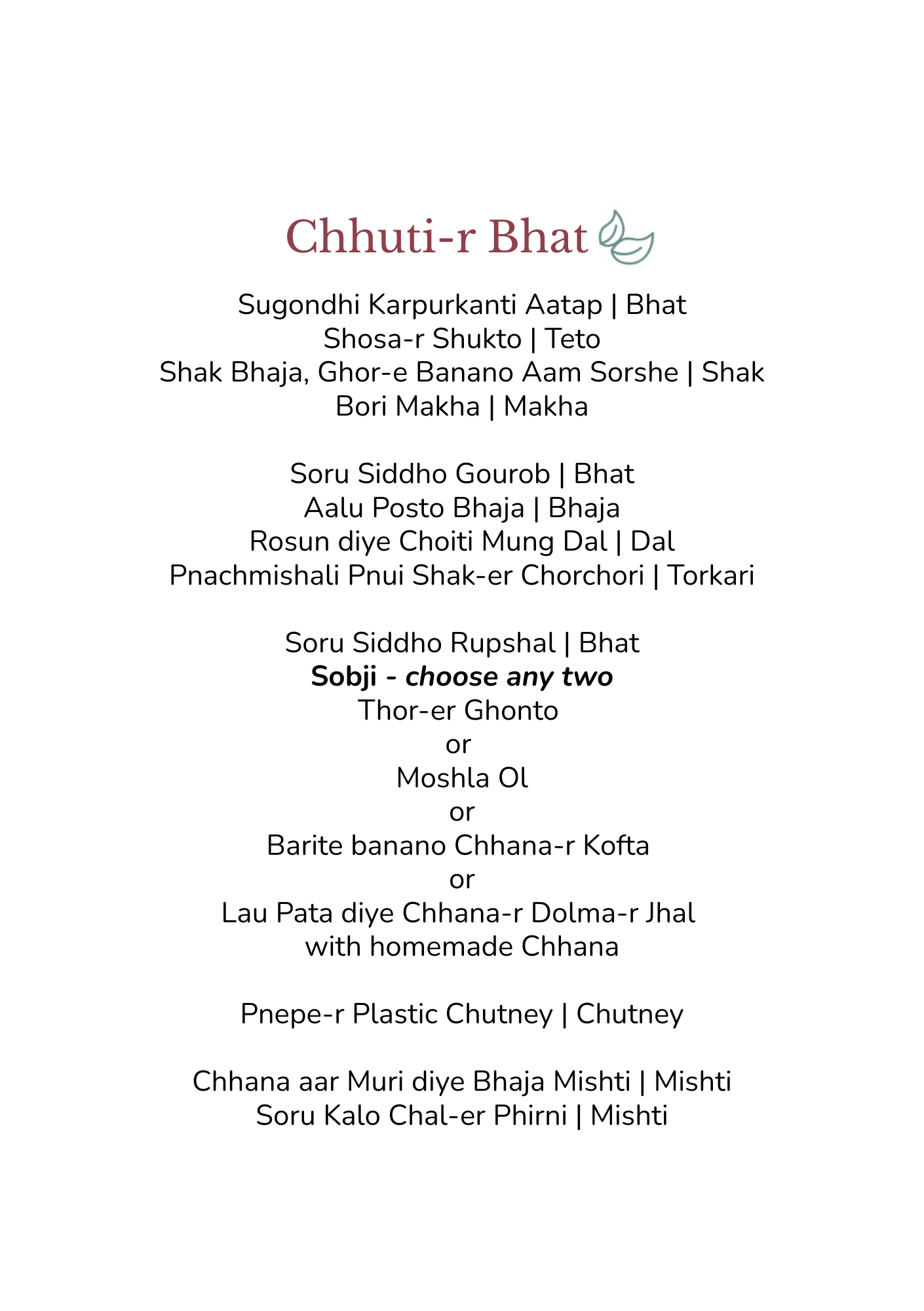 A full, indulgent meal with dishes, we grew up eating in Bengali homes. Each course serves a purpose for your palate. Take a seat on weekends and let us feed you, one home-cooked dish at a time. ছুটির ভাত is available on walk-in basis - but we appreciate it, if you reserve.