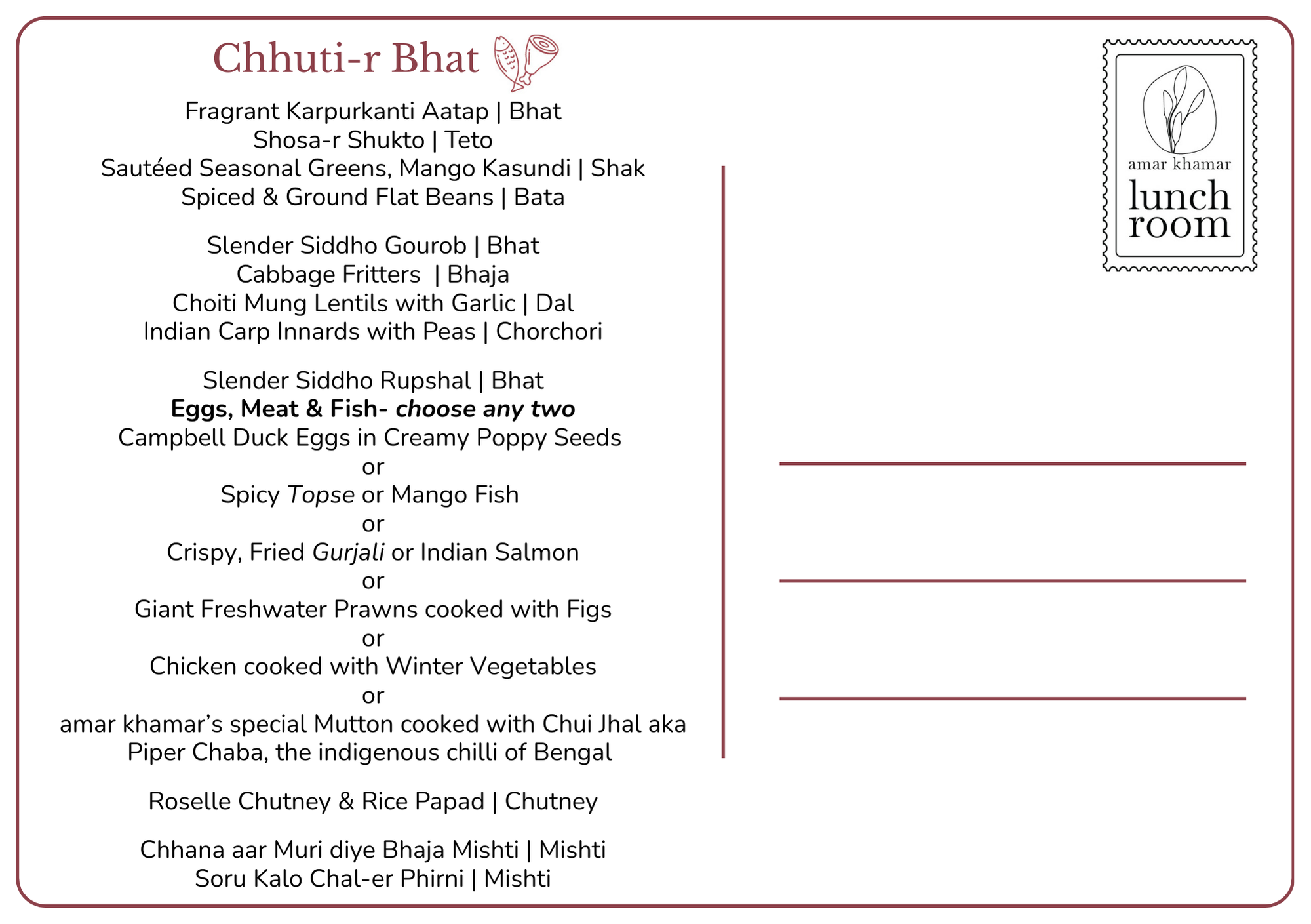 Hence, we have opened Amar Khamar Lunch Room, where we celebrate food shaped by years of unacknowledged excellence in the kitchens of our very homes. Food built by years of labour and love by our mothers, aunts and grandmothers. Dishes from the roots, made to remind you of the flavours of home.
