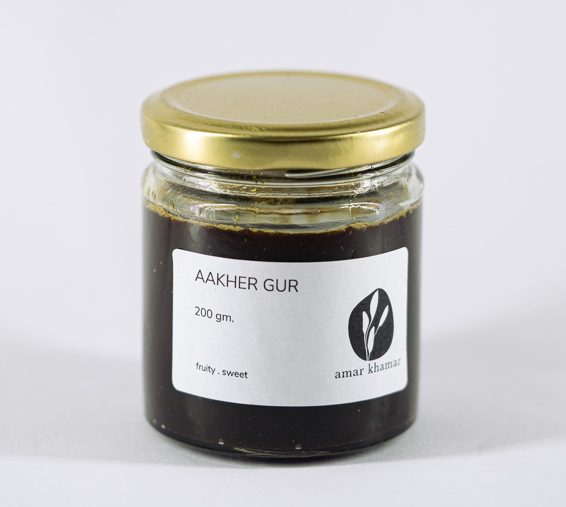 the gur comes in dark brown semi-liquid paste form in the jar |