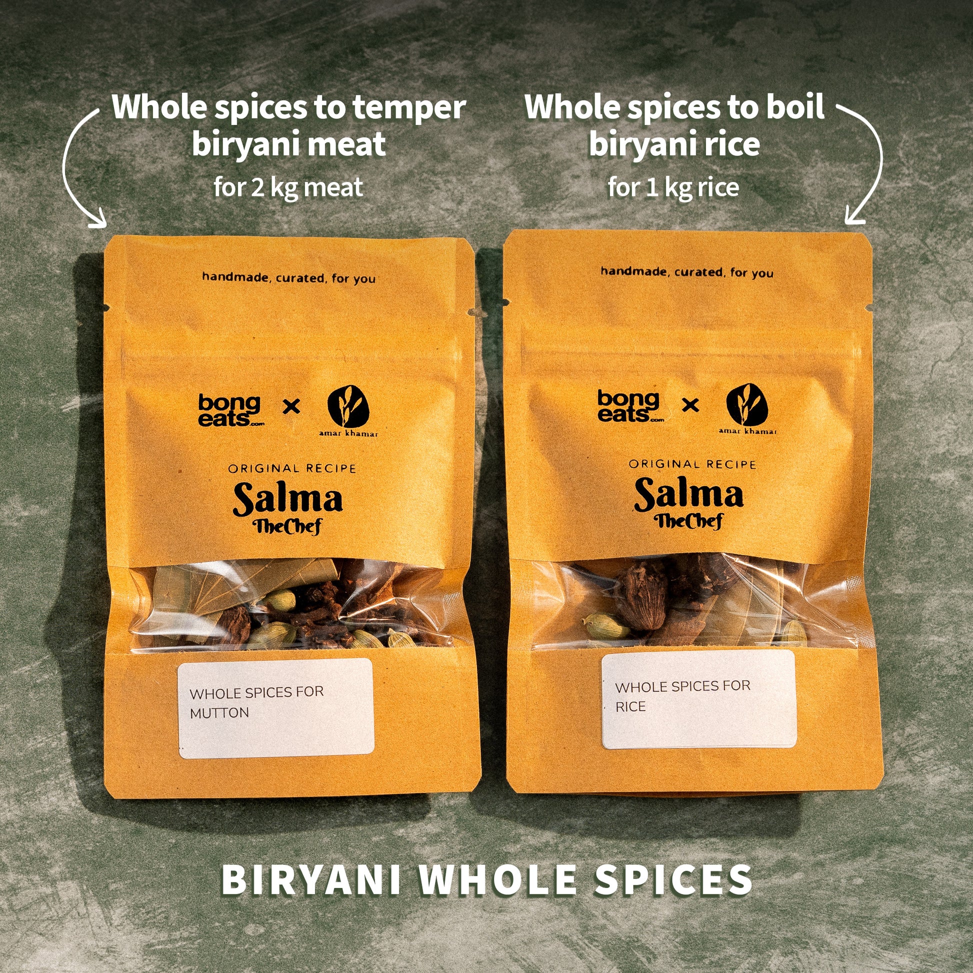 purity: Commercial spice mixes often use filler ingredients to save cost. It is not uncommon to see cardamom skins instead of whole cardamom, cinnamon leaves instead of bark cinnamon, and use of lower grade spices since they are going to be ground anyway. These biryani spice mixes are made using the exact recipe as the one available for free on Bong Eats’ Youtube channel, just like you would make them at home if you were following the recipe. There are no filler ingredients. No compromises are made on the quality of the spices.
