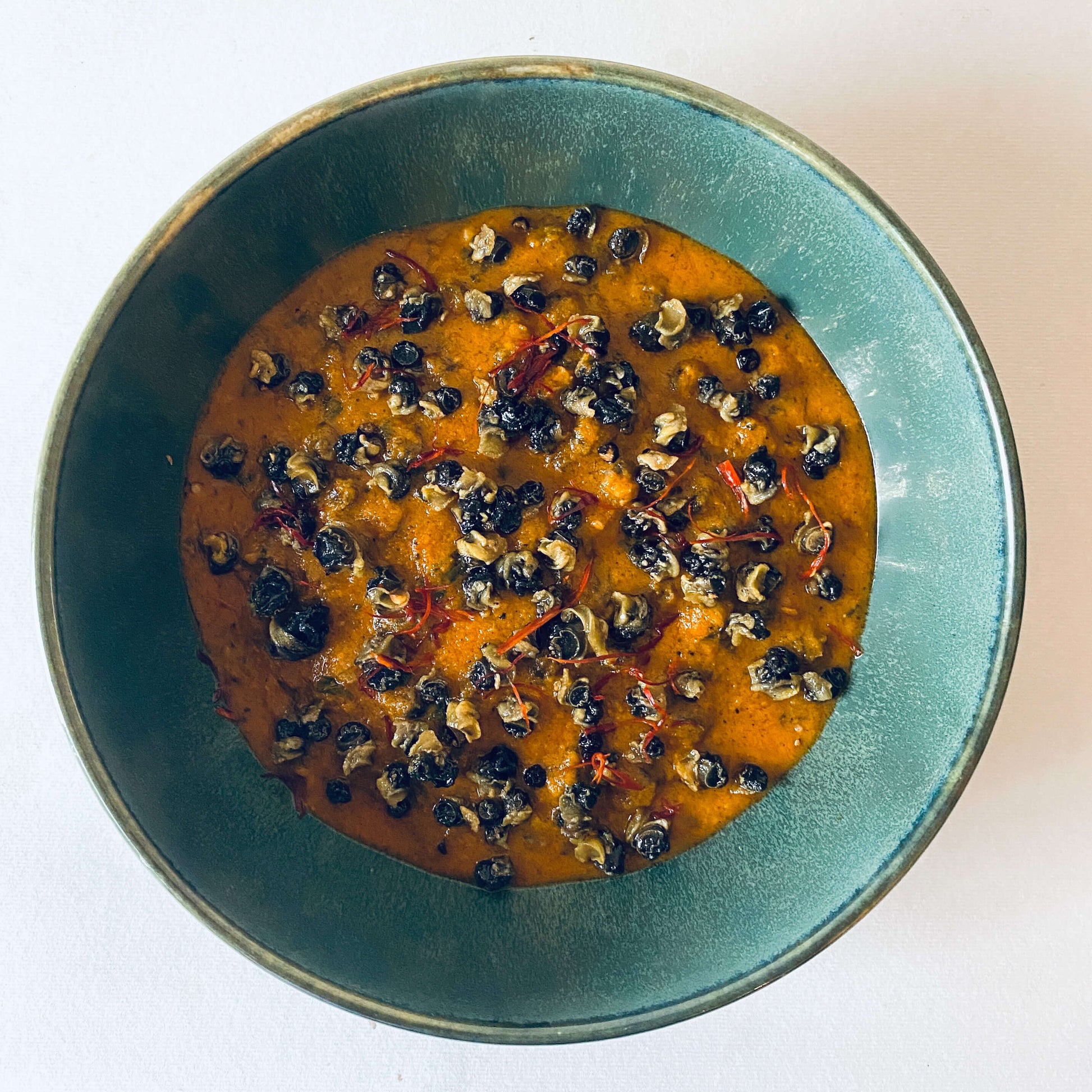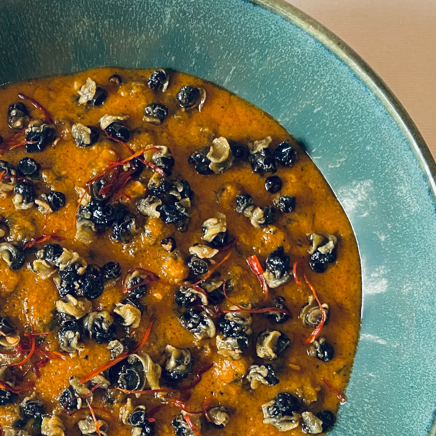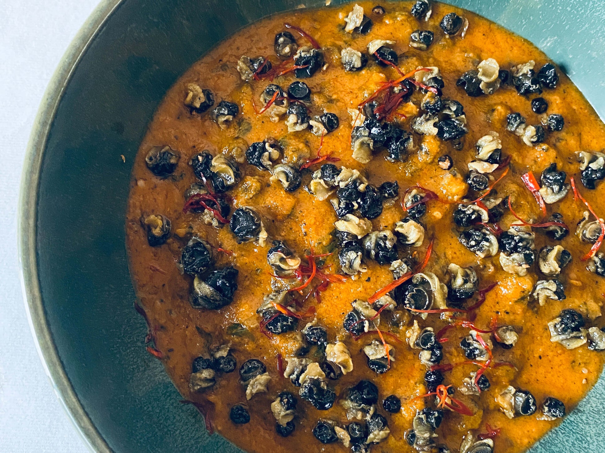 For Bnashkathi we have used some periwinkles in a light sauce flavoured with shio koji, chili, black pepper, perilla seeds and ghee. This lesser known ingredient, gneri-gugli as they are commonly known, forms part of the culinary ecosystem of the Sundarbans region, from where this particular rice variety has been sourced.