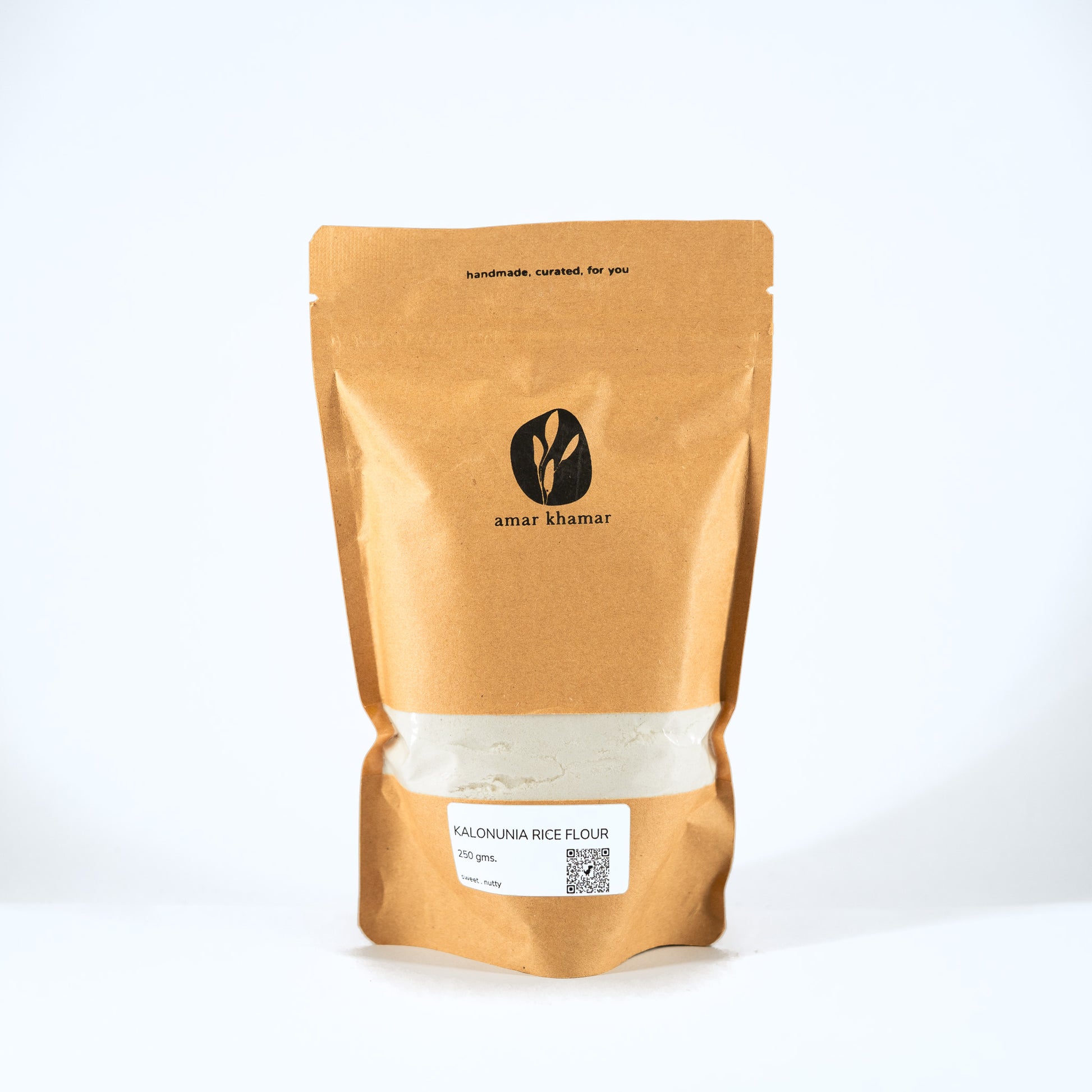 Ground from the aromatic folk rice variety, Kalonunia of Coochbehar, this one retains the characteristic flavour and aroma of the rice. The semi-polished rice results in a slightly grainy flour because of the bran that also helps in retaining the essential fibres.