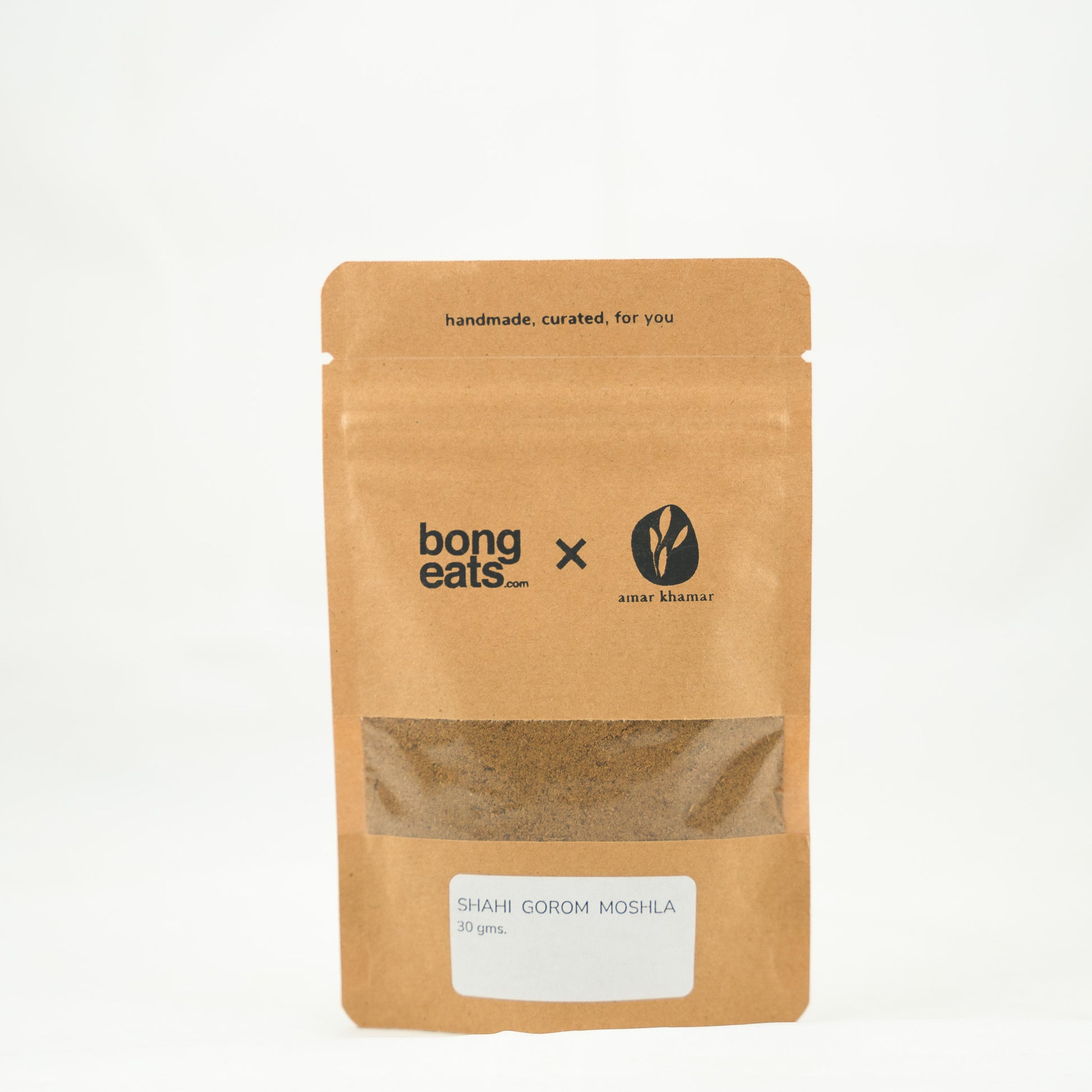 In our shahi gorom moshla, the plain Bengali gorom moshla (comprising only cardamom, cloves and cinnamon) is given the royal treatment by the addition of some more expensive spices such as mace, nutmeg, brown cardamom, etc. Shahi gorom moshla is best reserved for robust onion-ginger-garlic based meat or fish recipes such as kormas, kaliya, chaanp, khuska or polao. This is primarily a “finishing” spice, but is also used in marination for curries, kababs and more. We source premium-grade spices that we grind freshly by hand, in small batches, for the finest texture and flavour.